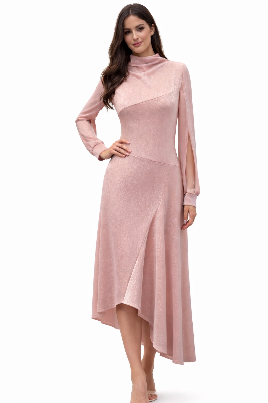 Jemně lesklý materiál v červánkově růžové barvě dodává šatům luxusní vzhled, zatímco asymetrická délka vytváří moderní a lehce dramatický efekt.