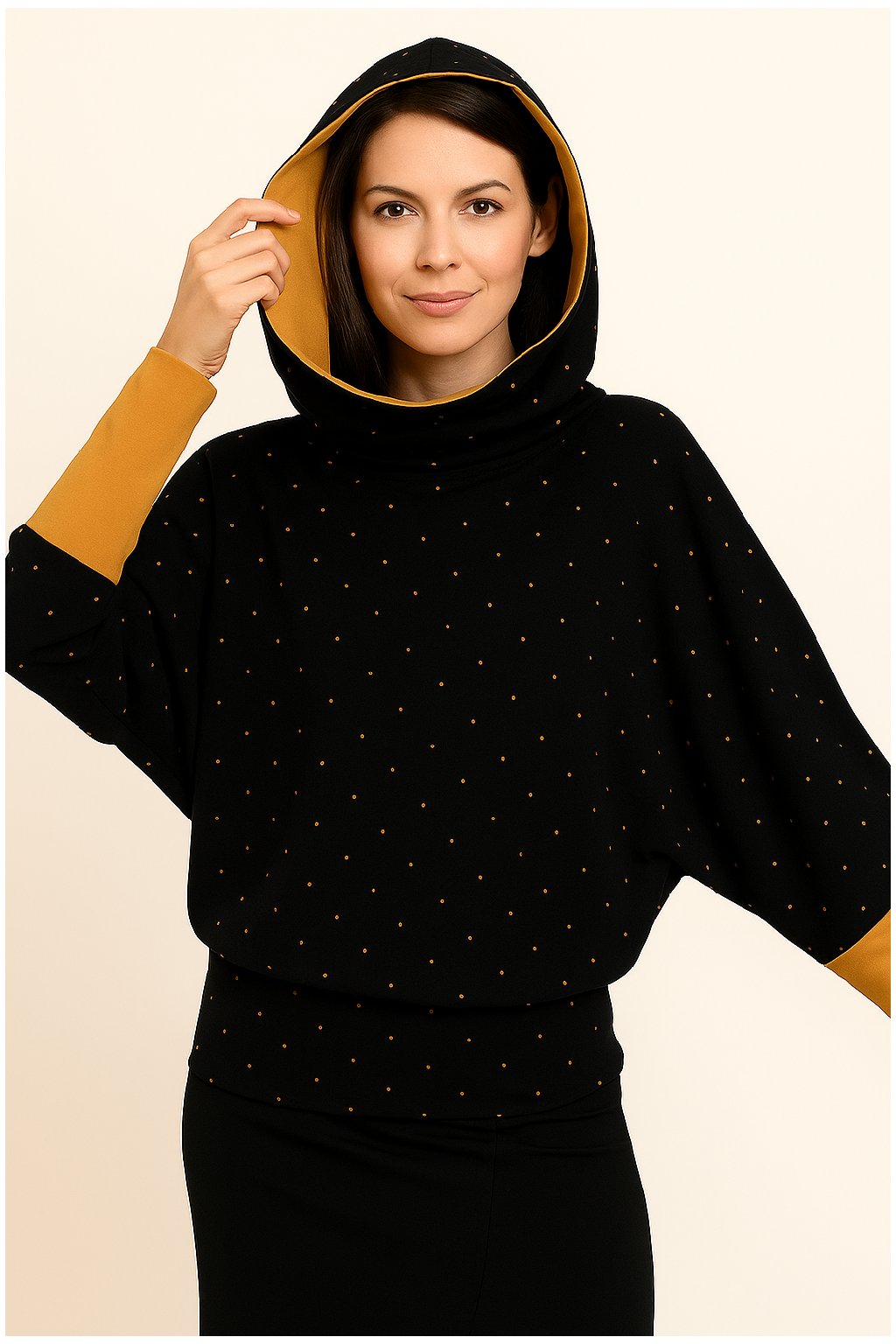 Elegantní mikina s kapucí a netopýřím střihem – pohodlná, stylová a jedinečná v každém detailu.