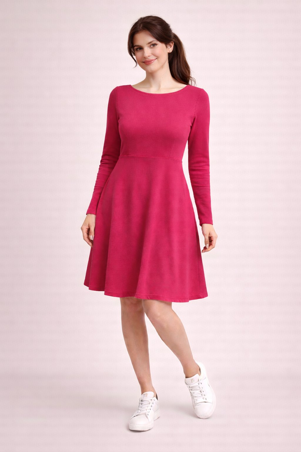 Výrazné ženské šaty ve fuchsiovo-jahodové barvě z měkké bavlněné teplákoviny s elastanem. Pohodlné, pružné a lichotivé – perfektní pro každý den i speciální příležitosti.