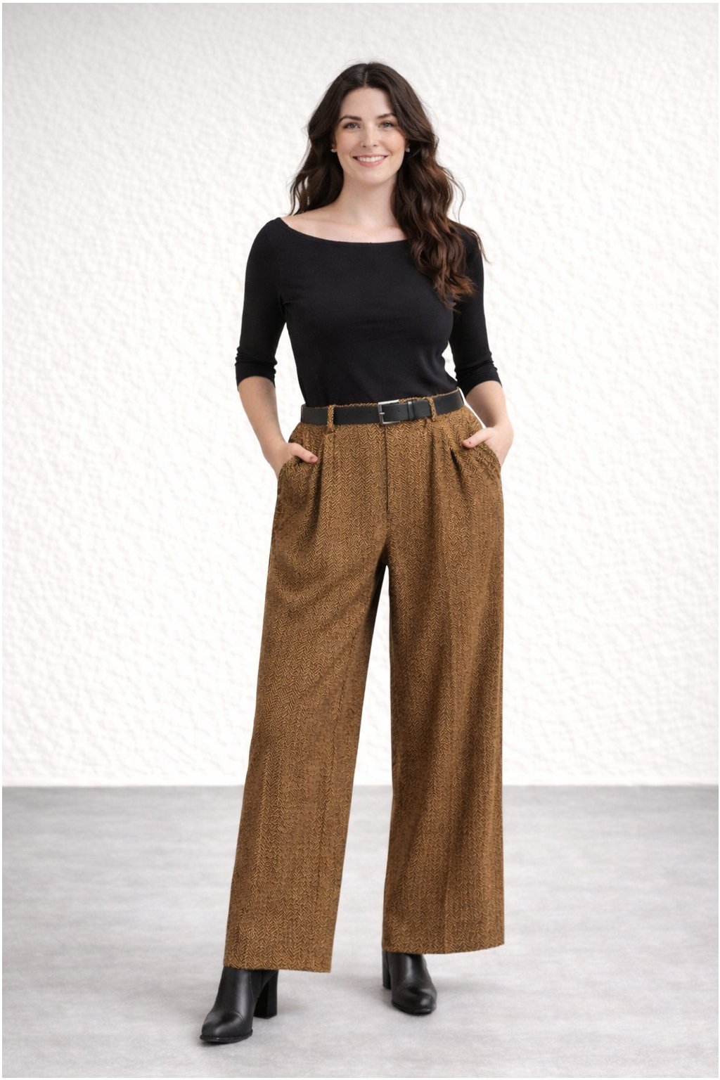Elegantní široké kalhoty s pružným pasem, výrazným předním skladem a černým páskem. Hřejivý hnědý tón působí měkce a nadčasově – snadno se kombinuje s černou, smetanovou i pudrovými odstíny.