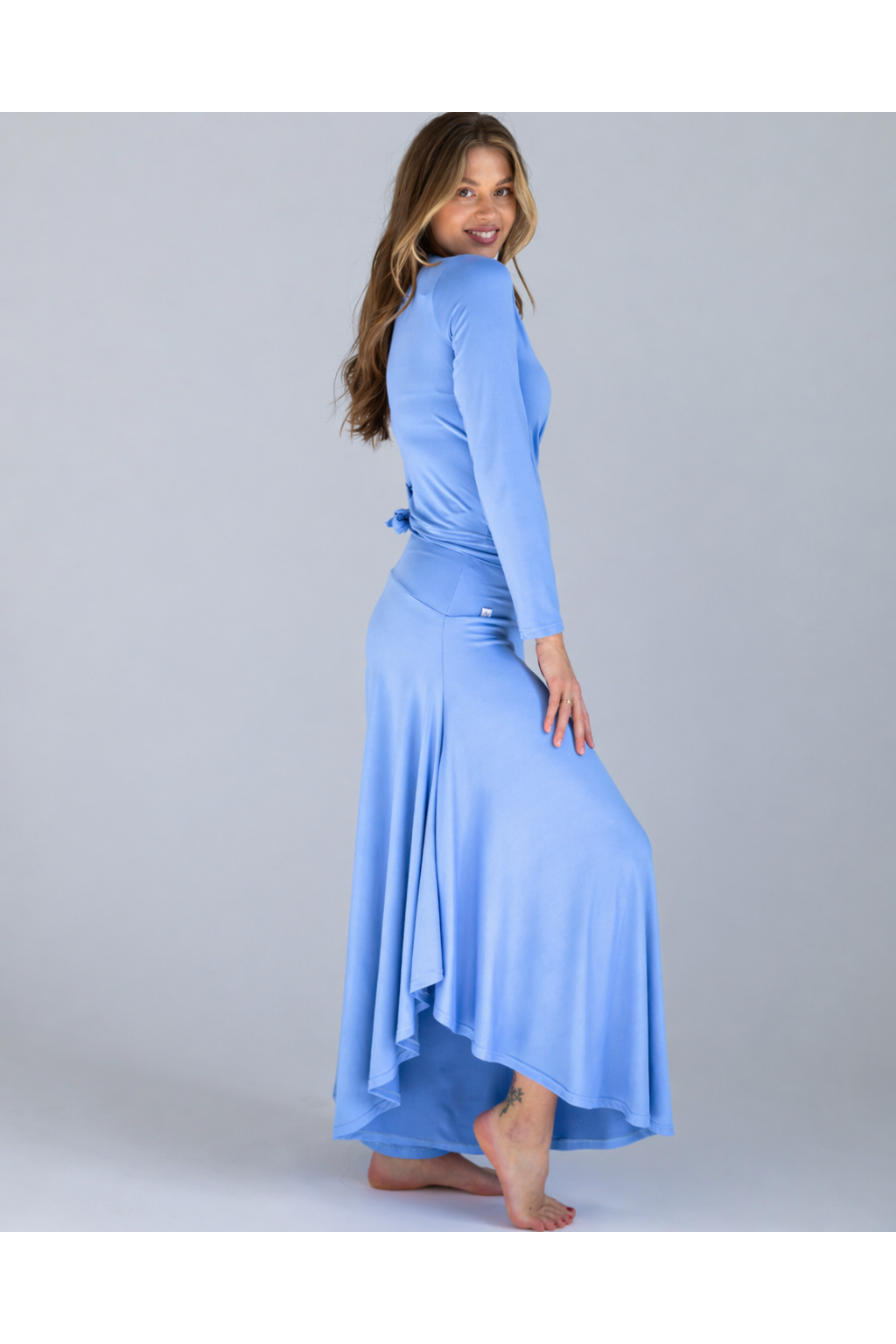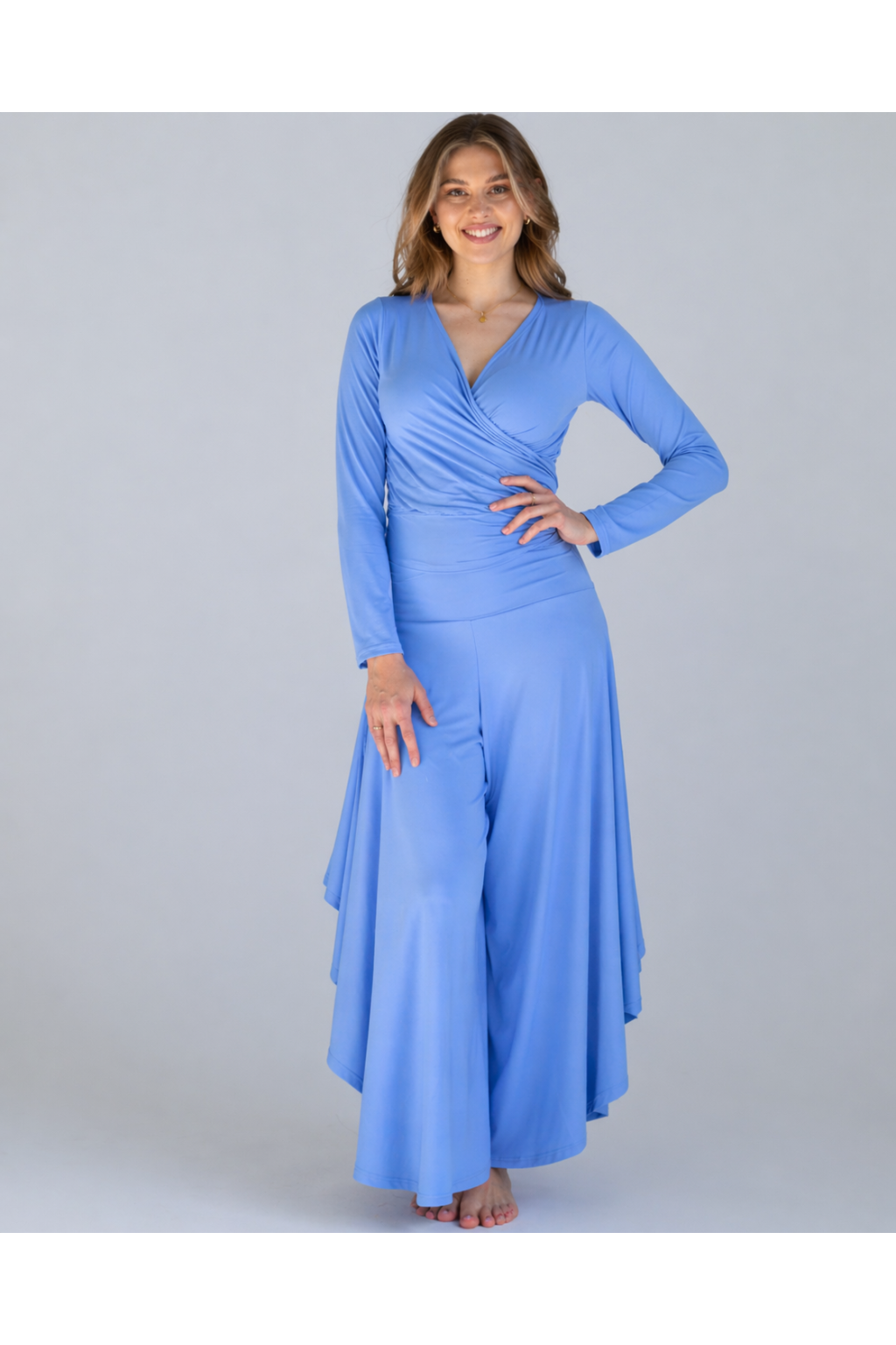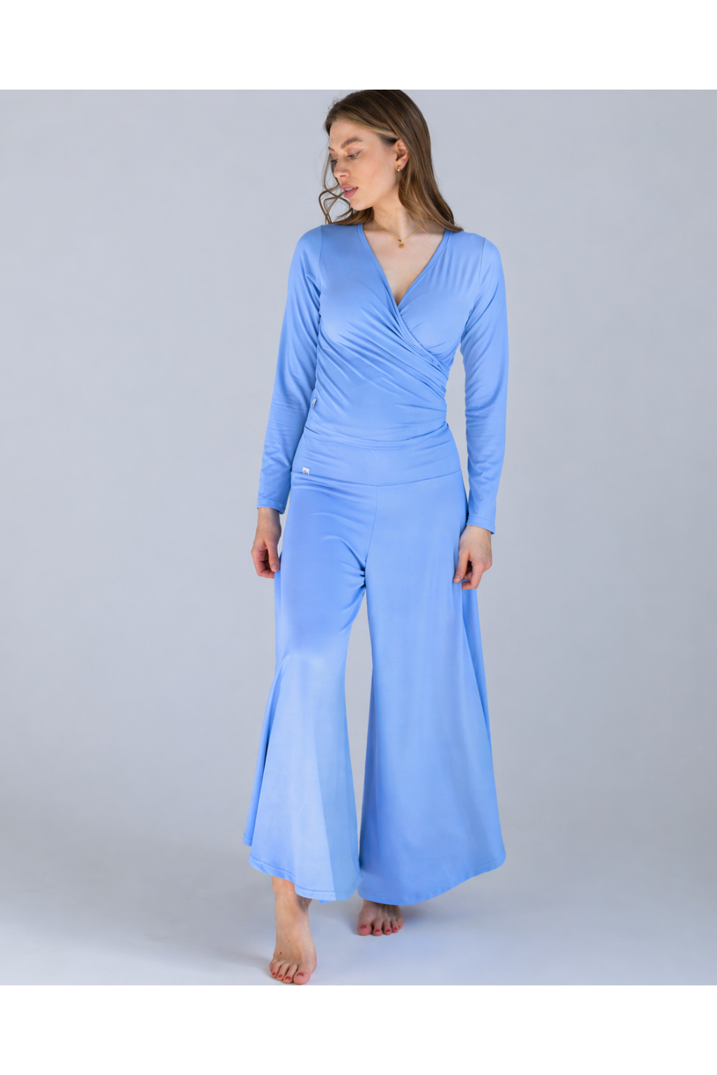 Objevte nadčasovou eleganci v podobě tohoto světle modrého kompletu, který dokonale propojuje ženskost, pohodlí a styl. Set tvoří splývavá kalhotová sukně a elegantní zavinovací top s dlouhým rukávem – ideální kombinace pro každou příležitost.