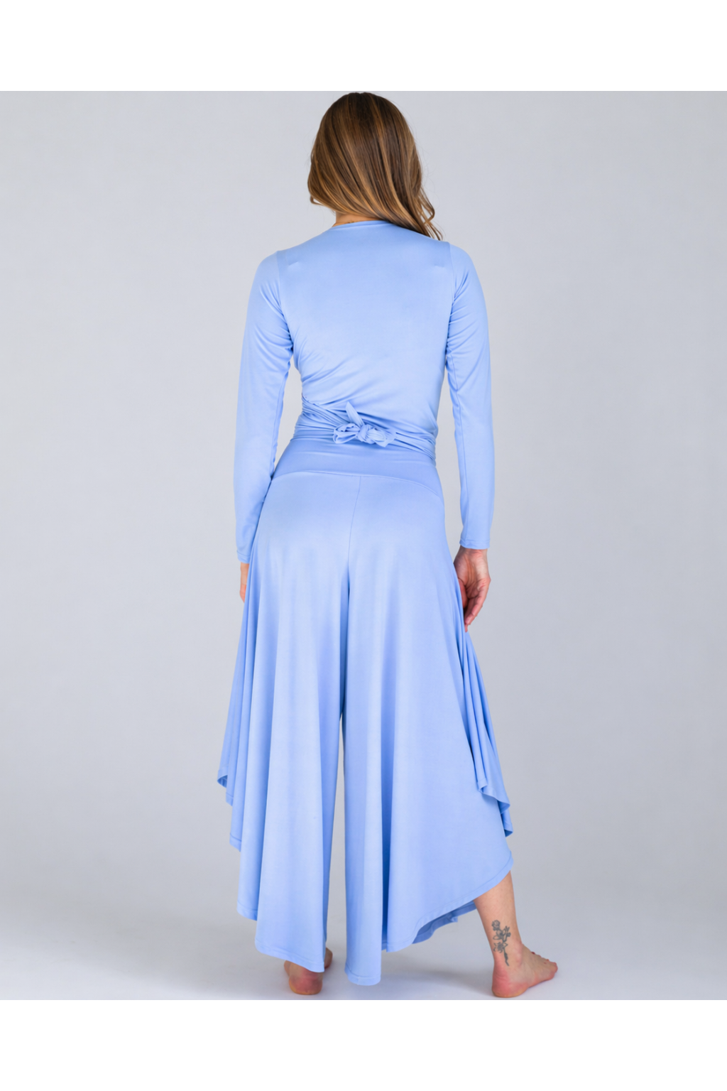 Světle modrý elegantní set – kalhotová sukně a zavinovací top z mléčného hedvábí