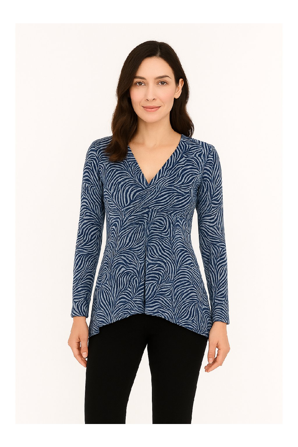 Elegantní tunika s netradičním zebřím vzorem v odstínech modré a tmavě inkoustové. Jemně přiléhavý střih s překřížením ve výstřihu krásně zvýrazní postavu a díky lehce prodloužené délce působí lichotivě a žensky. Vyrobena z materiálu mléčné hedvábí vyšší gramáže, který je mimořádně příjemný na dotek, prodyšný a lehce splývavý. Ideální volba pro ženy, které mají rády kombinaci pohodlí a elegance. Skvěle se hodí k džínům i elegantním kalhotám.